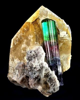 Ohromná, top kvalitní "partnerská záhněda" se zelenými turmalíny (drahokami verdelity), zcela unikátně rostlá, měnící zabarvení v průběhu dne, někdy se svým odstínem jeví spíše jako citrín. Jedná se navenek o velký monokrystal, přesto je patrné, že jde ve skutečnosti o nebývale harmonicky srostlé 2 krystaly, perfektně zapadající jeden do druhého - jejich plosky na sebe naprosto v linii navazují a tvoří tak dojem "dokonalého splynutí". Symbolika naprosté jednoty, vzájemné podpory a důvěrné spolupráce je velmi zřejmá. Využití tohoto kamene jako silného pomocníka v podpoře partnerství se vyloženě nabízí. Ať již v rovině osobní (stabilita a posílení vztahů, přivábení životního partnera), tak i v pracovní (spolupráce, jednota, dynamika). Postavitelný naplocho i na výšku