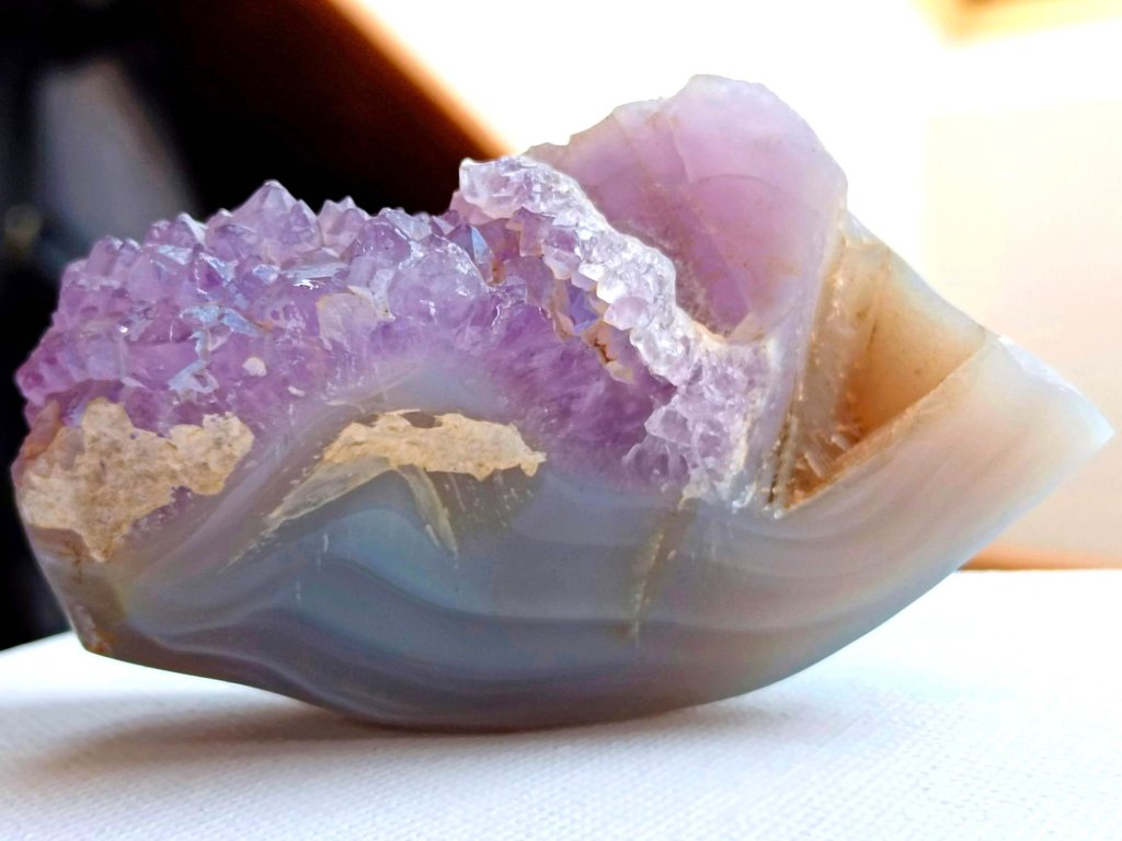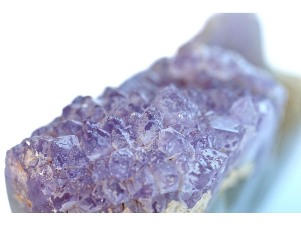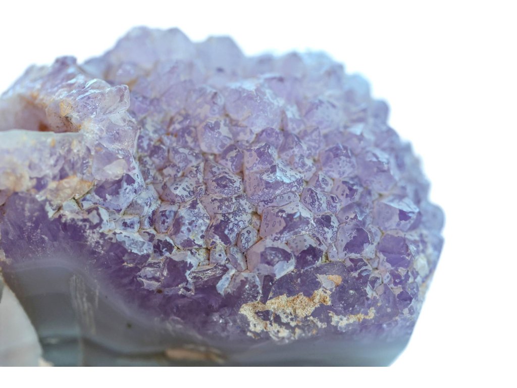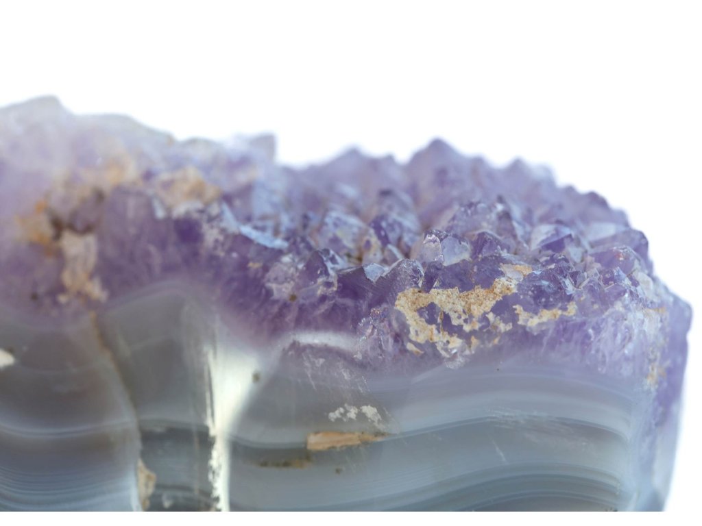 Ametyst na modrém chalcedonu - 157 g, výjimečná pastelová kombinace, bez horniny Ametystová drúza na chalcedonu, broušená. Madagaskar. 8 x 5,2 x 3,3 cm