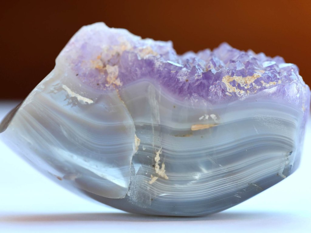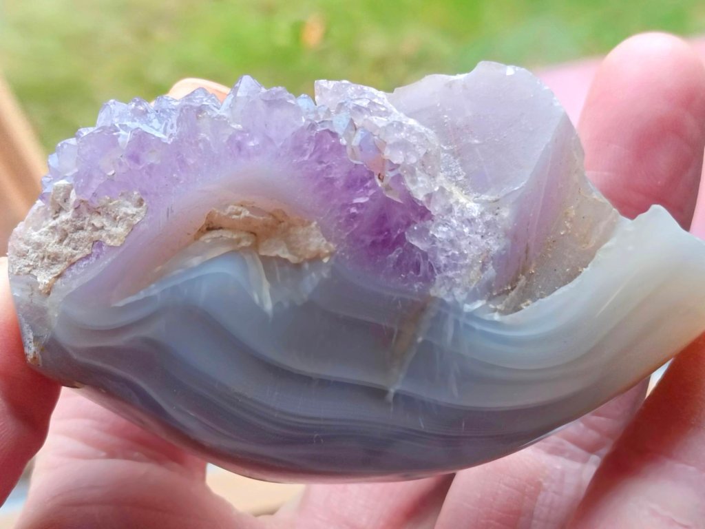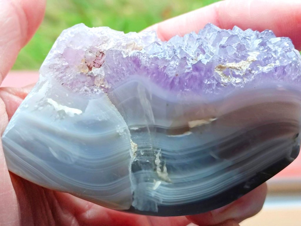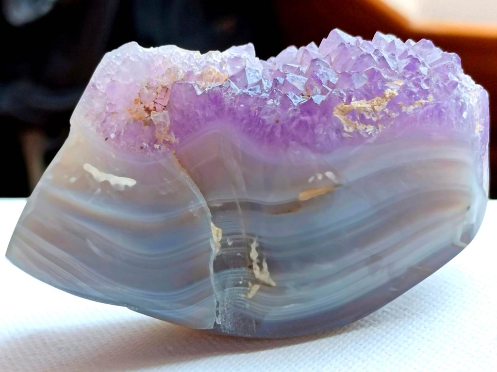 Ametyst na modrém chalcedonu - 157 g, výjimečná pastelová kombinace, bez horniny Ametystová drúza na chalcedonu, broušená. Madagaskar. 8 x 5,2 x 3,3 cm