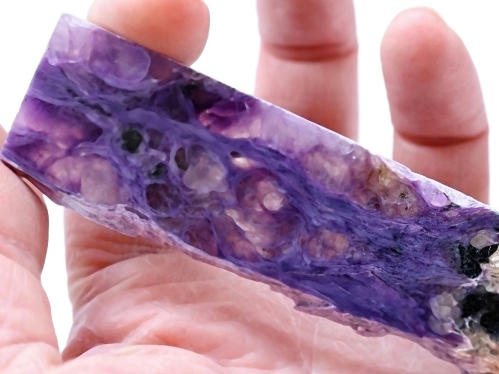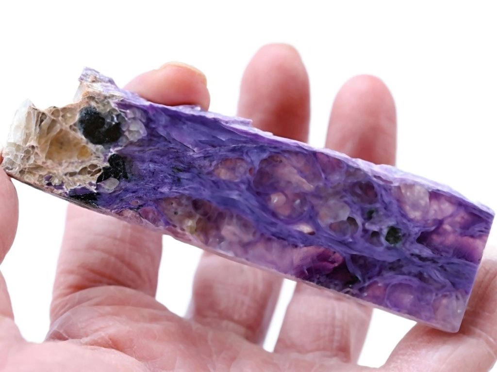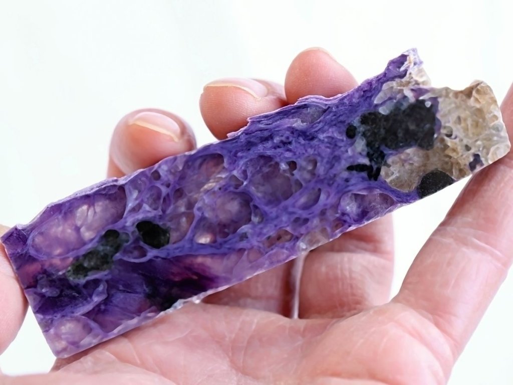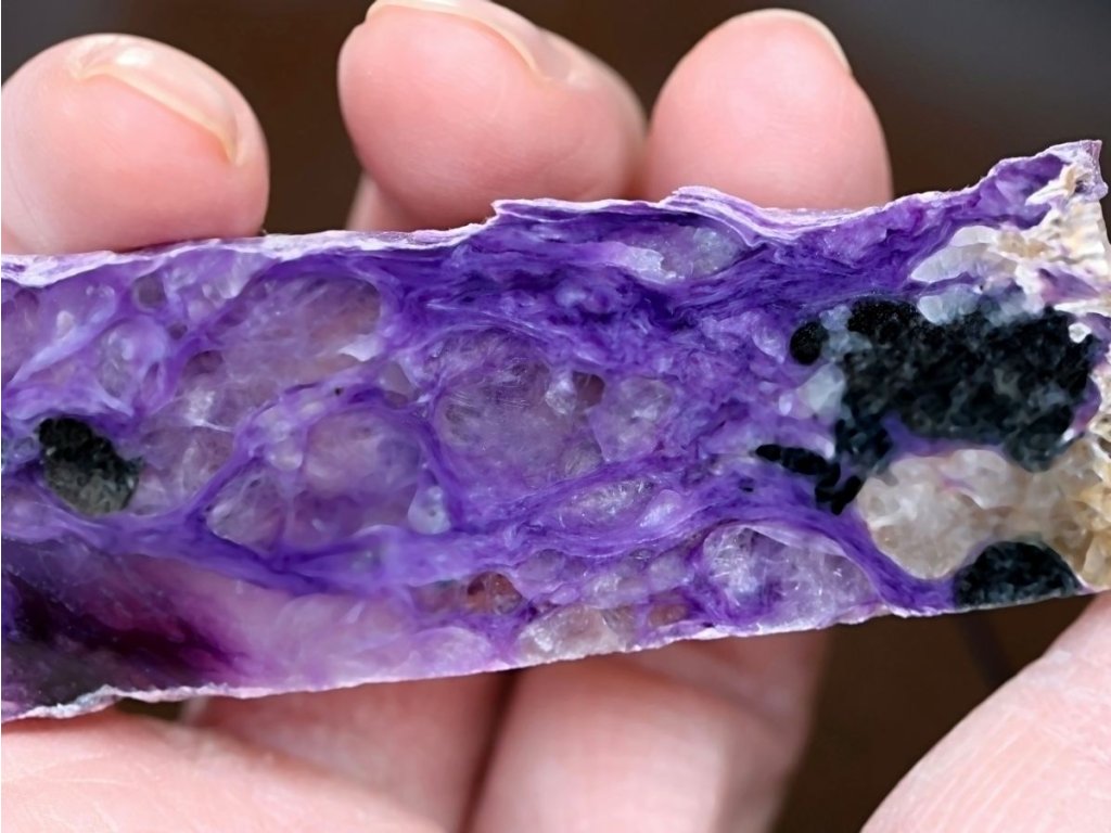Upozornění: Čaroit je sice křemičitan (obsahuje i spoustu jiných prvků - mangan, železo, sodík, hliník aj.), je však poměrně citlivý na pád z výšky, proto je s ním třeba zacházet obezřetně, aby se nepoškodil. Také doporučuji nevystavovat ho dlouhodobému přímému slunečnímu záření, aby časem nevybledl. Nežádoucí je i delší kontakt s vodou - namáčení.