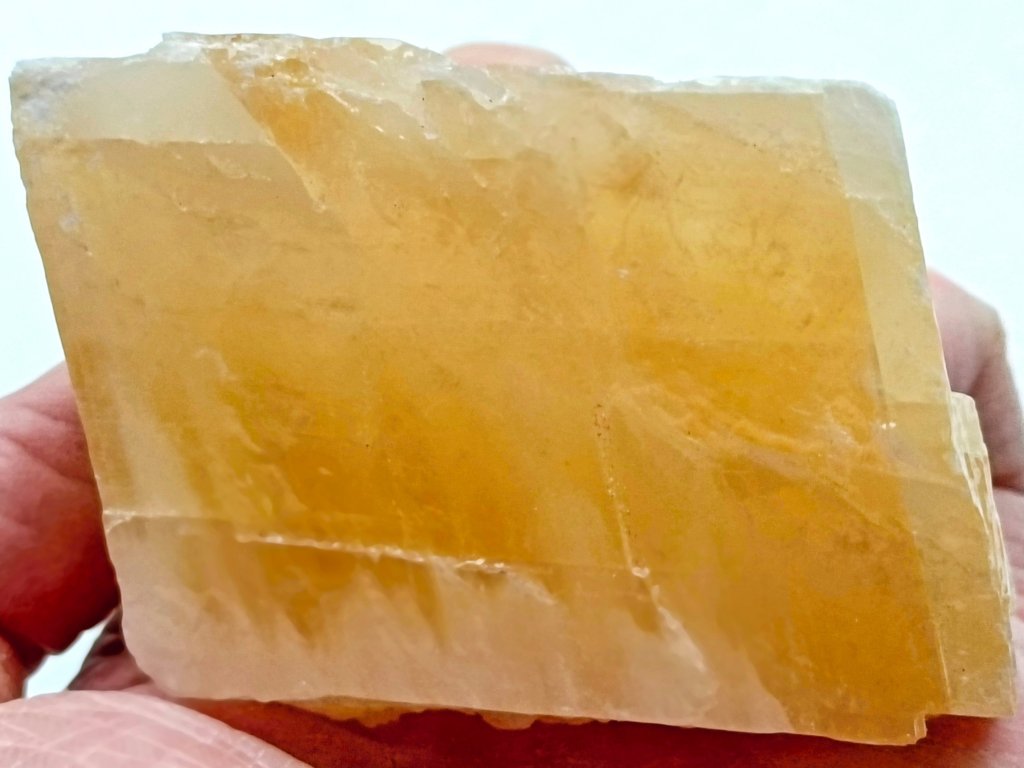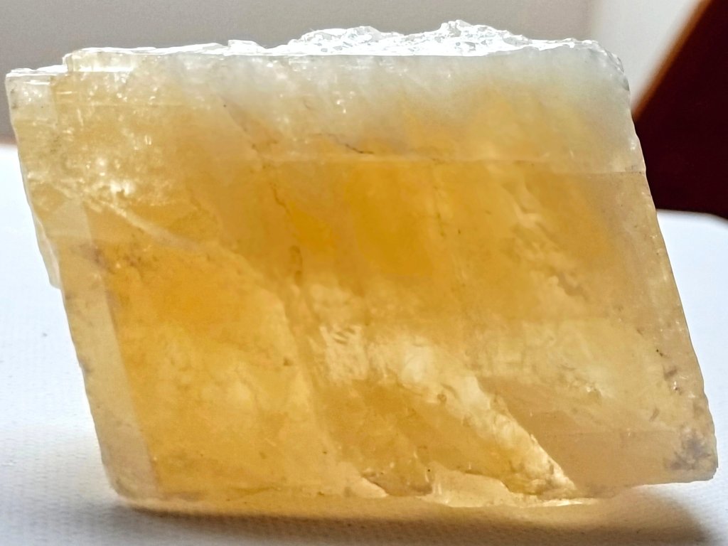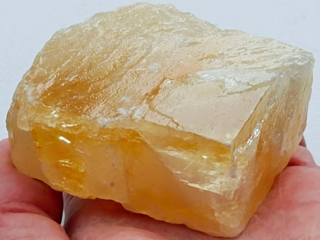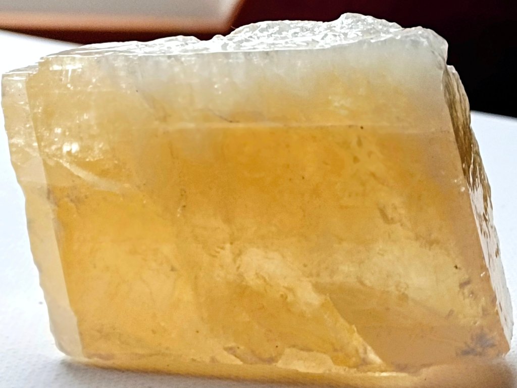 Kalcit žlutý 239 g "Paralelní světy" - průsvitný krystal Zlatavý/citrínový kalcit. Mexiko. 6,9 x 5,4 x 3,3 cm
