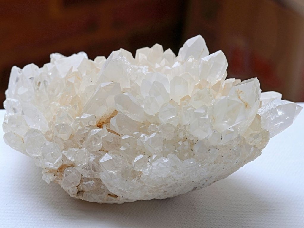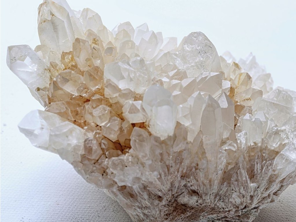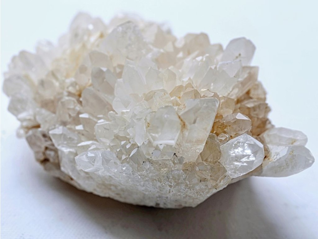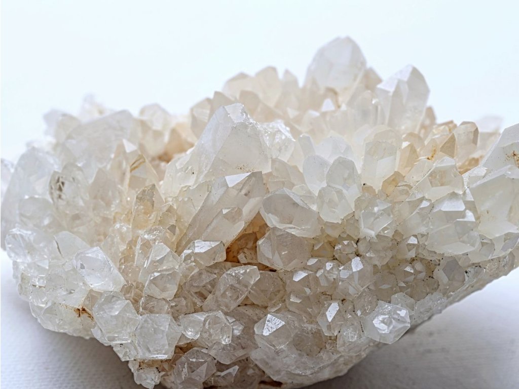Křišťál drúza 683 g - s bílým kalcitem a místy s limonitem Sněžný křišťál s kalcitem. Madagaskar. 13,8 x 7 x 6,8 cm