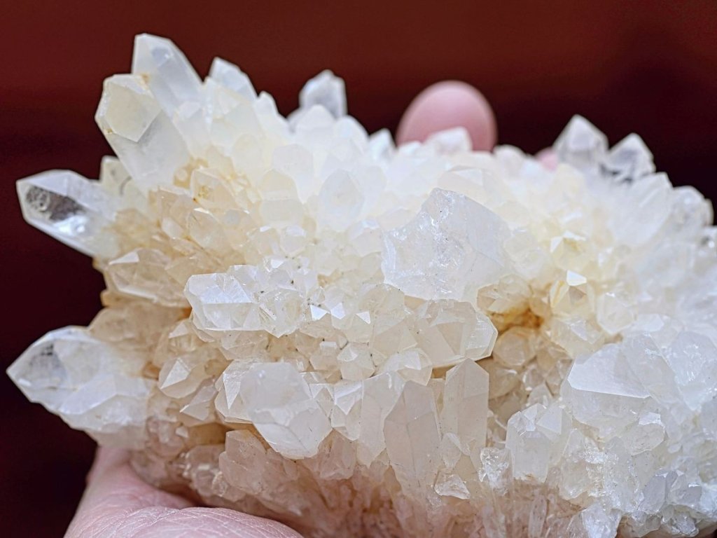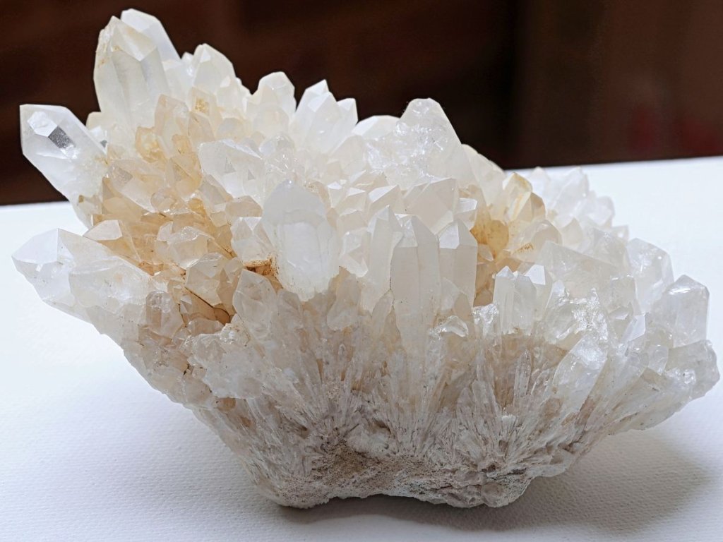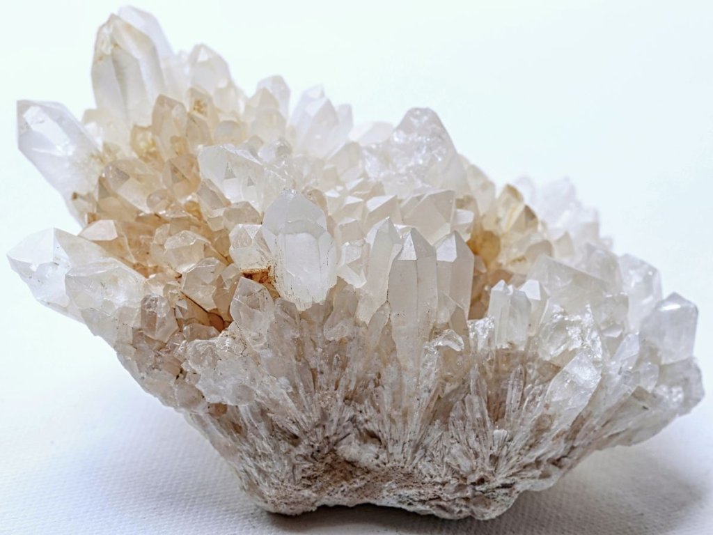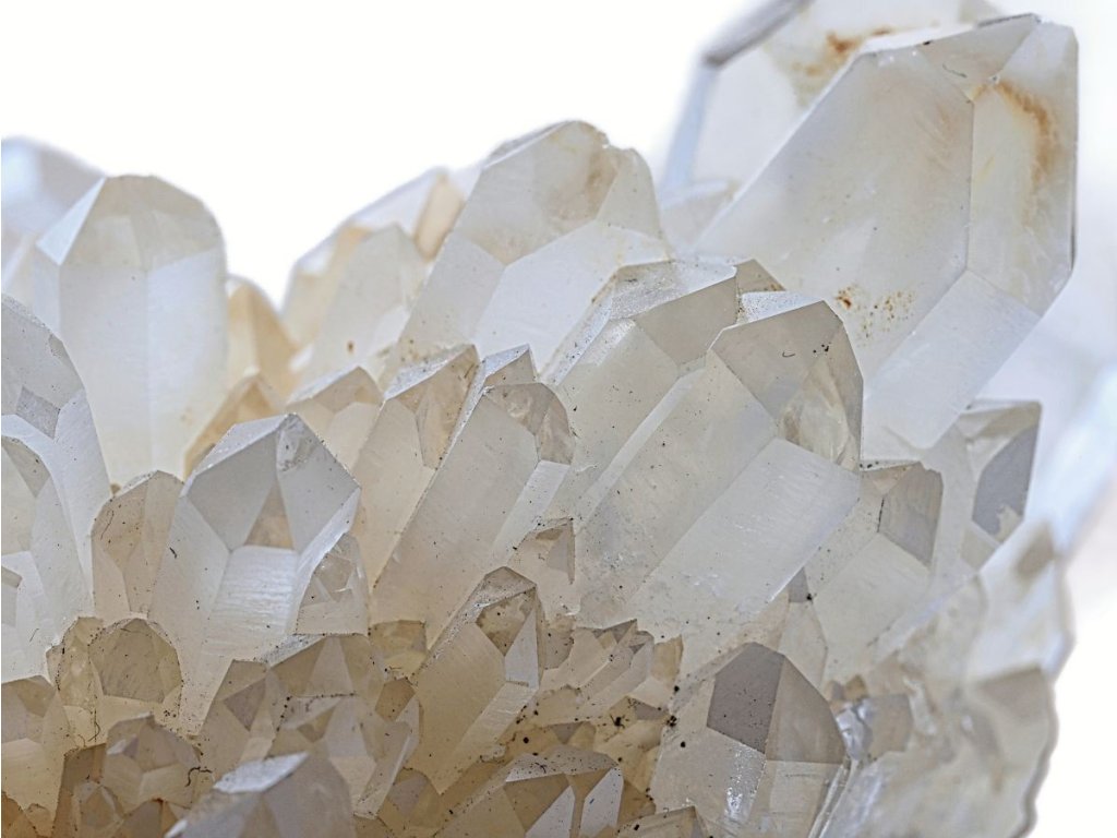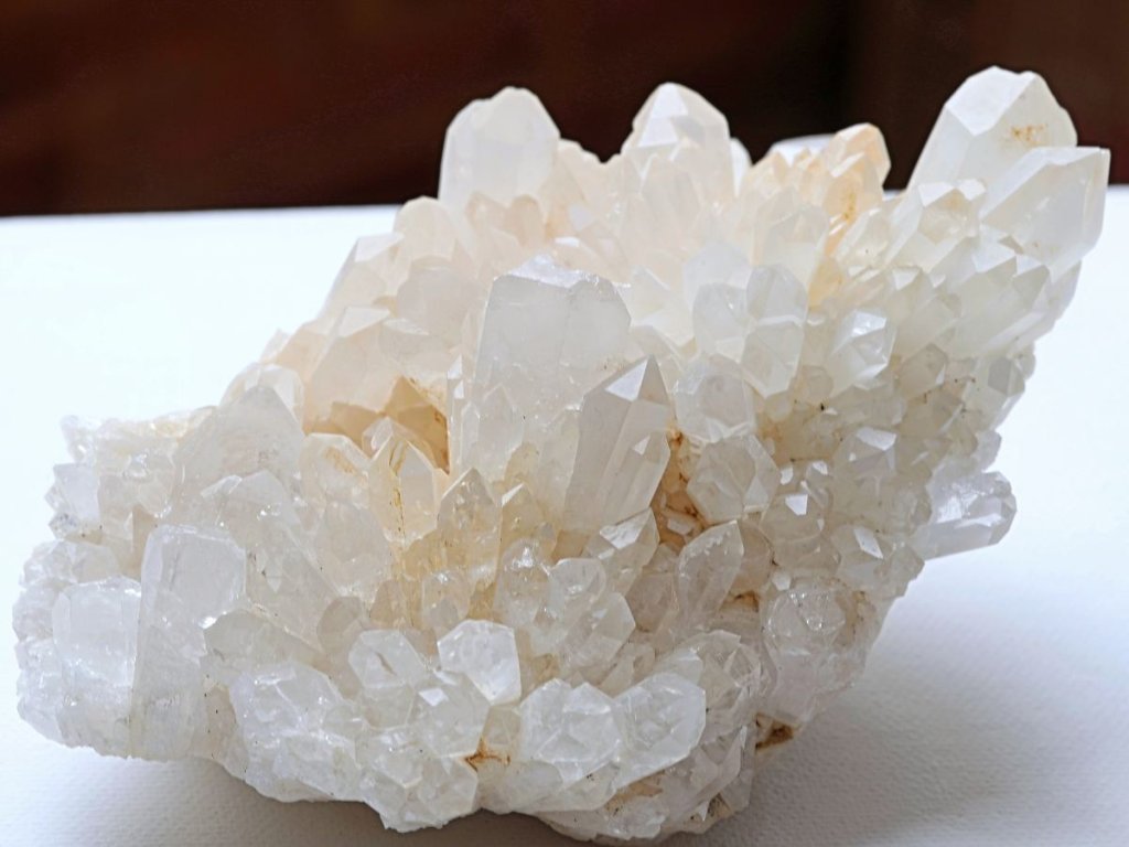 Křišťál drúza 683 g - s bílým kalcitem a místy s limonitem Sněžný křišťál s kalcitem. Madagaskar. 13,8 x 7 x 6,8 cm