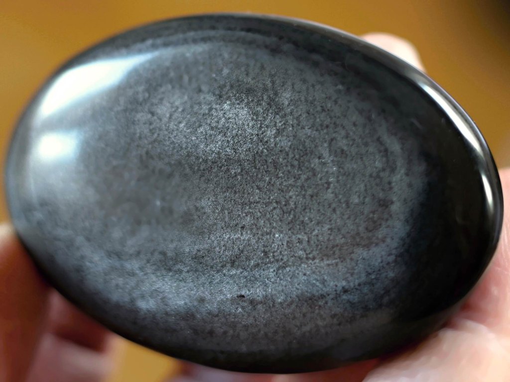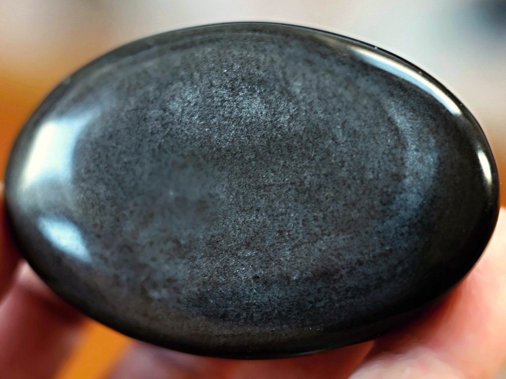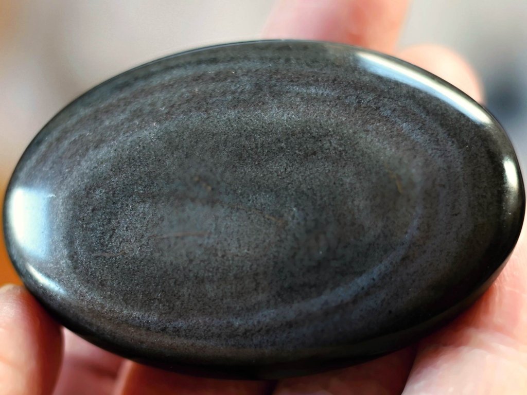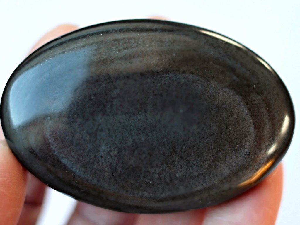 Obsidián "strážné oko" 7,1 cm - jemně leštěný ochranný talisman Kvalitní broušený perleťový/stříbšitý. Mexiko. 88 g