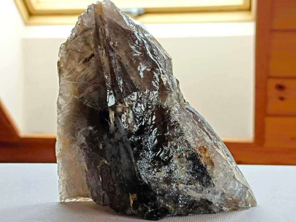 Velká průsvitná špice české záhnědy se "zrcátky" a vnitřní duhou v její hlubině ("Dévický chrám"), stabilní na rovné ploše ve 2 pozicích bez potřeby stojánku.